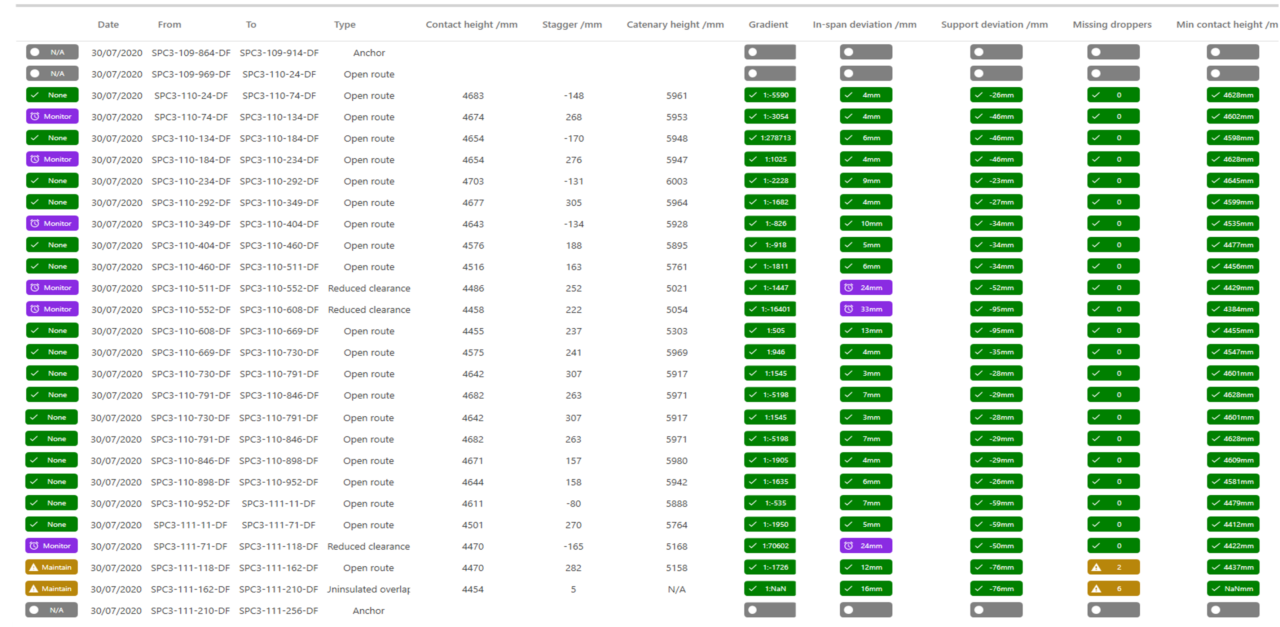 OLE StAT additionally offers a high-level dashboard summary of the wire analysis introducing a ‘traffic light’ system based on the specified installation or maintenance thresholds. The OLE StAT dashboard output in enables a high level system conformance check which enables a comprehensive schedule for snagging or maintenance interventions to be passed on to the installer/maintainer. In the case of OVH Wizard acquisition where both messenger and contact wires are mapped specific dropper lengths can be identified. In the case of NMT data where the contact wire is only available relative length corrections can be assigned to individual droppers within individual spans.