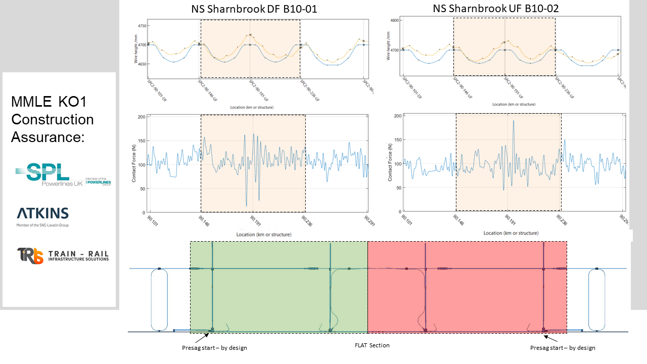 Single Rod Arthur Flurry Neutral Sections are capable of operation up to 125mph, but they are acknowledged as rigid components with separate allowances in the applicable interface performance criteria specified by the NTSN Section 4.2.12. The static wire profilometry data are collected by NMT NR service train and the analysis is carried out by OLE StAT. The dynamic interface data are collected by the MENTOR NR service train using an Brecknell Willis (BW) HSA pantograph instrumented by DBST. The NMT data enabled to an up-to-date view of the system following on-site adjustments post the original installation. It is noted that a slight ‘hogging’ can be observed in both directions at the Neutral Section supports. The overall forces collected at 100mph are within acceptable levels with the Down Fast direction likely to incur local loss of contact at higher speeds or multiple pantograph formations (Fmin < 0N, NQ[%] > 0).